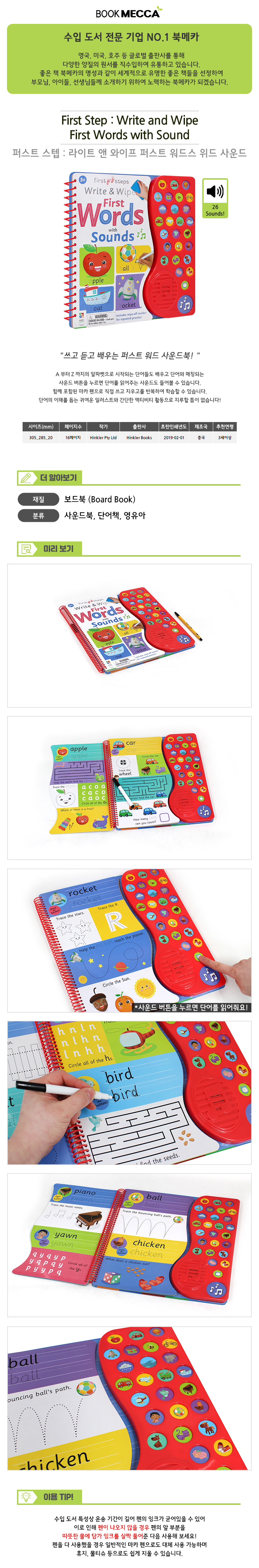 | 도서명 | First Step : Write and Wipe First Words with Sound (마카 펜 포함) - 사운드북/보드북 | ||